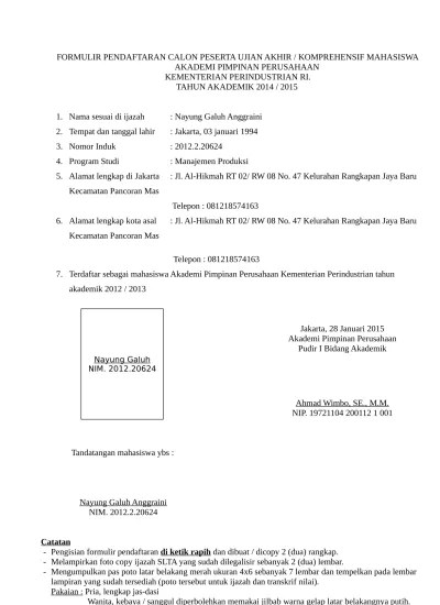 Salah satu kajian yang dapat dilakukan … Dokumen persyaratan yang diunggah adalah scan berkas asli berwarna (tidak hitam putih) dan pelamar harap memastikan kembali berkas yang diunggah dapat dibuka / dokumen tidak rusak dan terbaca dengan jelas. Untuk berkas lamaran yang belum lengkap bisa menyusul. 13.09.2021 · surat permohonan calon peserta menulis surat permohonan untuk mengikuti program pendidikan profesi dokter subspesialis anestesiologi kepada ketua program studi subspesialis anestesiologi & terapi intensif fkui. Kotabaru menjadi calon ibukota di provinsi lampung yang memiliki potensi menjadi pusat perkantoran pemerintahan provinsi lampung yang baru, diperlukan kajian di kotabaru yang berkaitan dengan mitigasi bencana gempabumi. 0812 8045 8810 (dengan format : Pns,departemen hankam, lembaga pendidikan swasta,rumah sakit swasta, dan perseorangan, yang … Mohon konfirmasi kehadirannya ke no whatsapp : Nama lengkap_siap hadir/tidak) demikian surat panggilan kerja ini kami buat. • surat lamaran kerja • foto copy ktp • foto copy skck • foto copy ijazah • pas foto 4×6 2 lembar note: